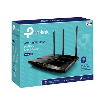 Use the TP-Link Tether mobile app, available on iOS and Android, to easily set up and manage your TP-Link Archer A7 AC1750 Wireless Dual-Band Gigabit Router. With Wi-Fi 5 (802.11ac) connectivity, the Archer A7 has dual bands, 2.4 GHz and 5 GHz. The router can reach up to 450 Mb/s on 2.4 GHz and 1300 Mb/s on 5 GHz for a total of 1750 Mb/s. For temporary visitors, you can set up a guest network with limited, timed access to ensure your personal Wi-Fi network remains safe and prevents unauthorized access.